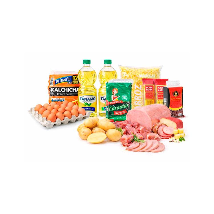 1kg jamón  1kg queso 2 aceite 900ml 1 frijol 500g 1 arroz 1kg 1 salchicha  1 cartón huevo  5 lb papa 1 café 250g 2 espaguetis 250g